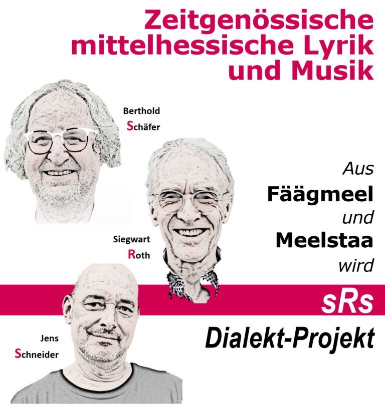 Berthold Schäfer, Siegward Roth und Jens Schneider, von den Formationen „Fäägmeel“ und „Meelstaa“ her altbekannte Protagonisten mittelhessischer Mundartkultur, stehen hinter dem Trio „s-R-s Dialekt-Projekt“ als nunmehr gereifte Super-Boygroup, um dem heimischen „Platt“ in neuem Format frischen Wind zu verpassen! Siegward Roth, der Altmeister mittelhessischer Dialektik gibt literarische Kostproben aus seinen aktuellen und früheren Werken, die von Berthold Schäfer und Jens Schneider mit filigran arrangierter, akustischer Musik im bewährten „Fäägmeel“- und „Meelstaa“-Fahrwasser umspielt und abgerundet werden – eine Konzertlesung der besonderen Art!